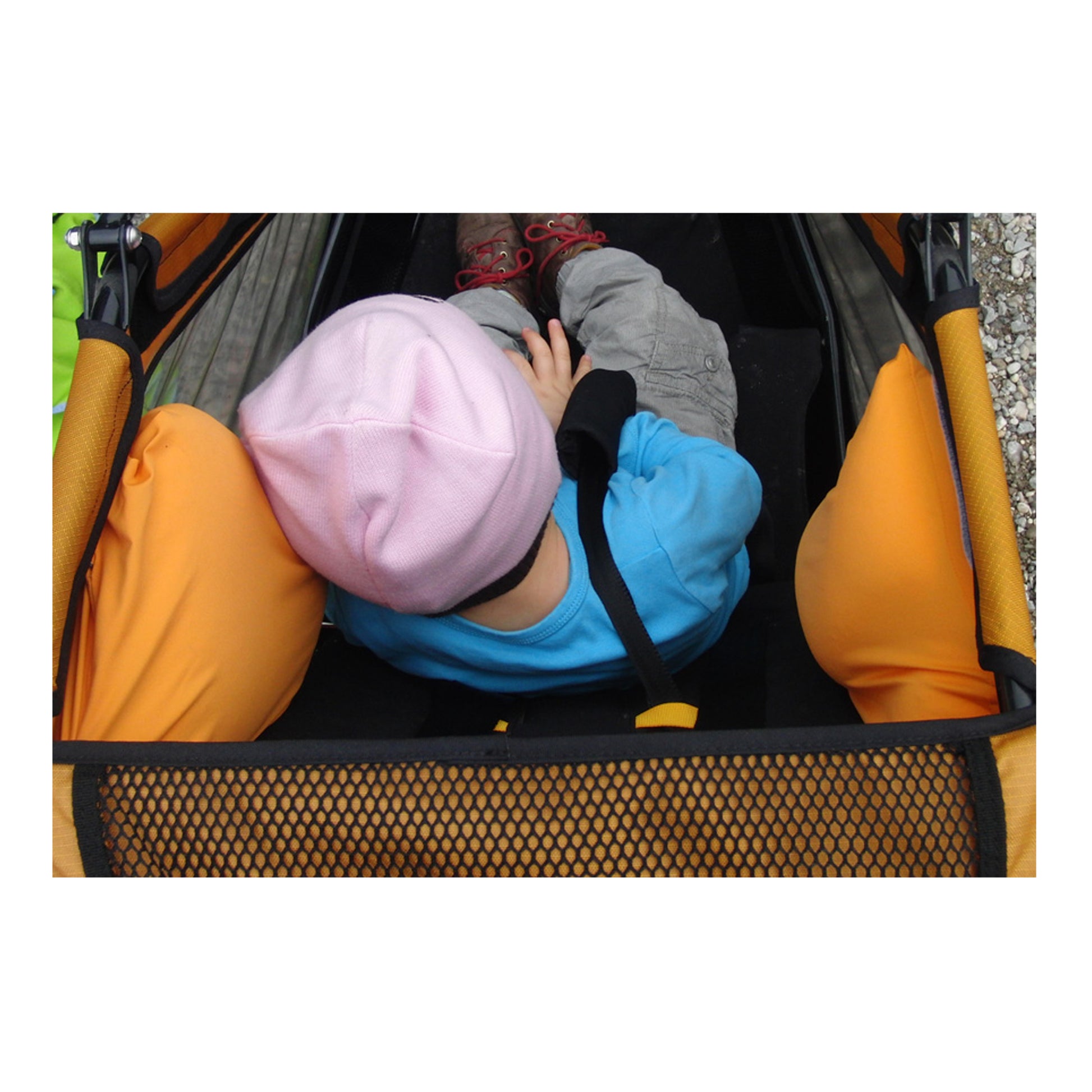 The PU pillow cover is wipeable and washable at 60°C. The filling consists of ESP balls, which have an excellent damping properties and offer great protection (in case of a tip-over or crash). Remove the pillows from the trailer for a lunch-time nap or a trip in a car or train, The pillow insert is easily removed and inserted into the supplied soft pillowcase.