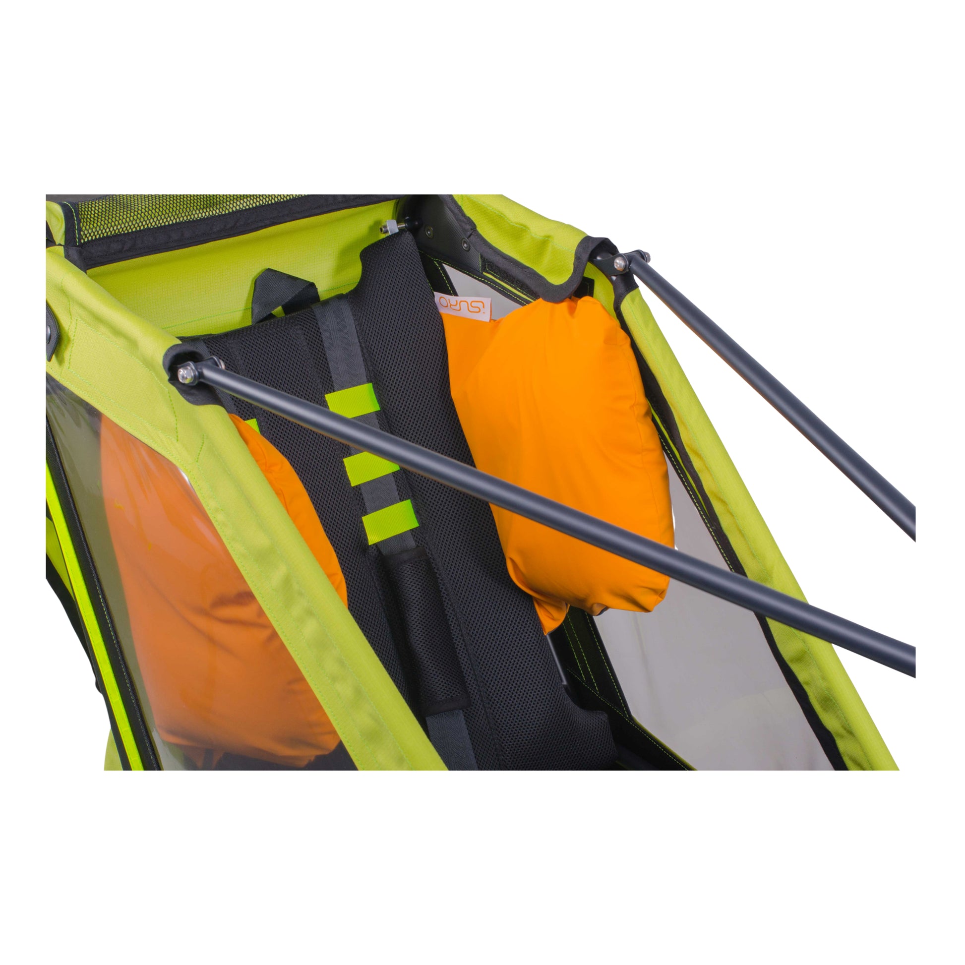 iSURO - the pillow for the Singletrailer & for on the go! Together with iSURO, we have developed a pillow that fits perfectly into the Singletrailer and lets your child sleep even better. It forms to your child and stabilizes the their head while sleeping. The pillow is fastened to the frame of the trailer and to the seat with Velcro straps, and the height can be adjusted for a perfect fit. The pillow can be used flexibly right or left, or as a pair.